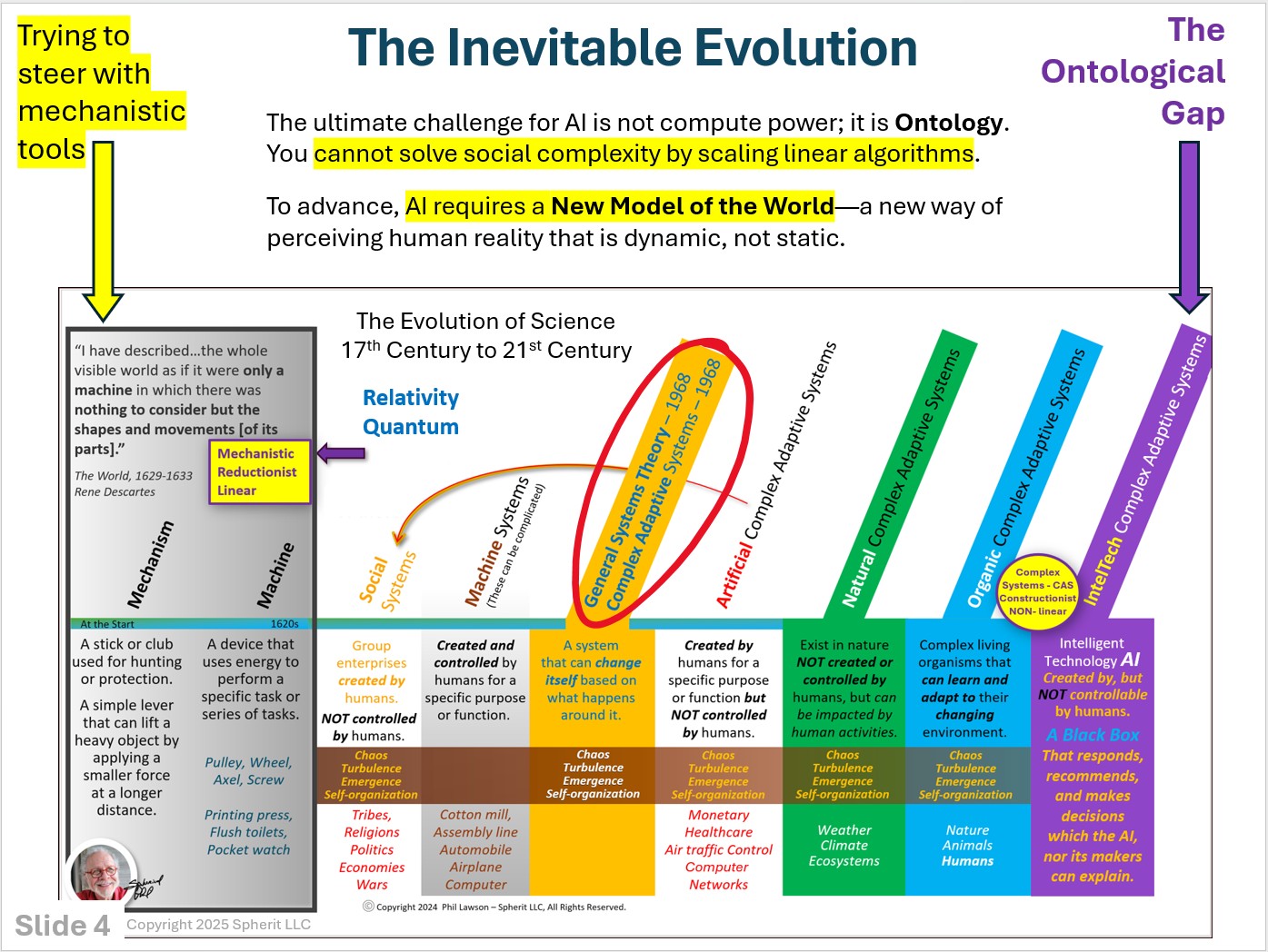 While physics and biology moved into “Complexity Science” decades ago, current AI architecture is still largely relying on linear, probabilistic models. This creates an “Ontological Gap.” We are trying to use linear tools to solve non-linear human problems. This diagram shows why simply scaling compute won’t bridge that divide.